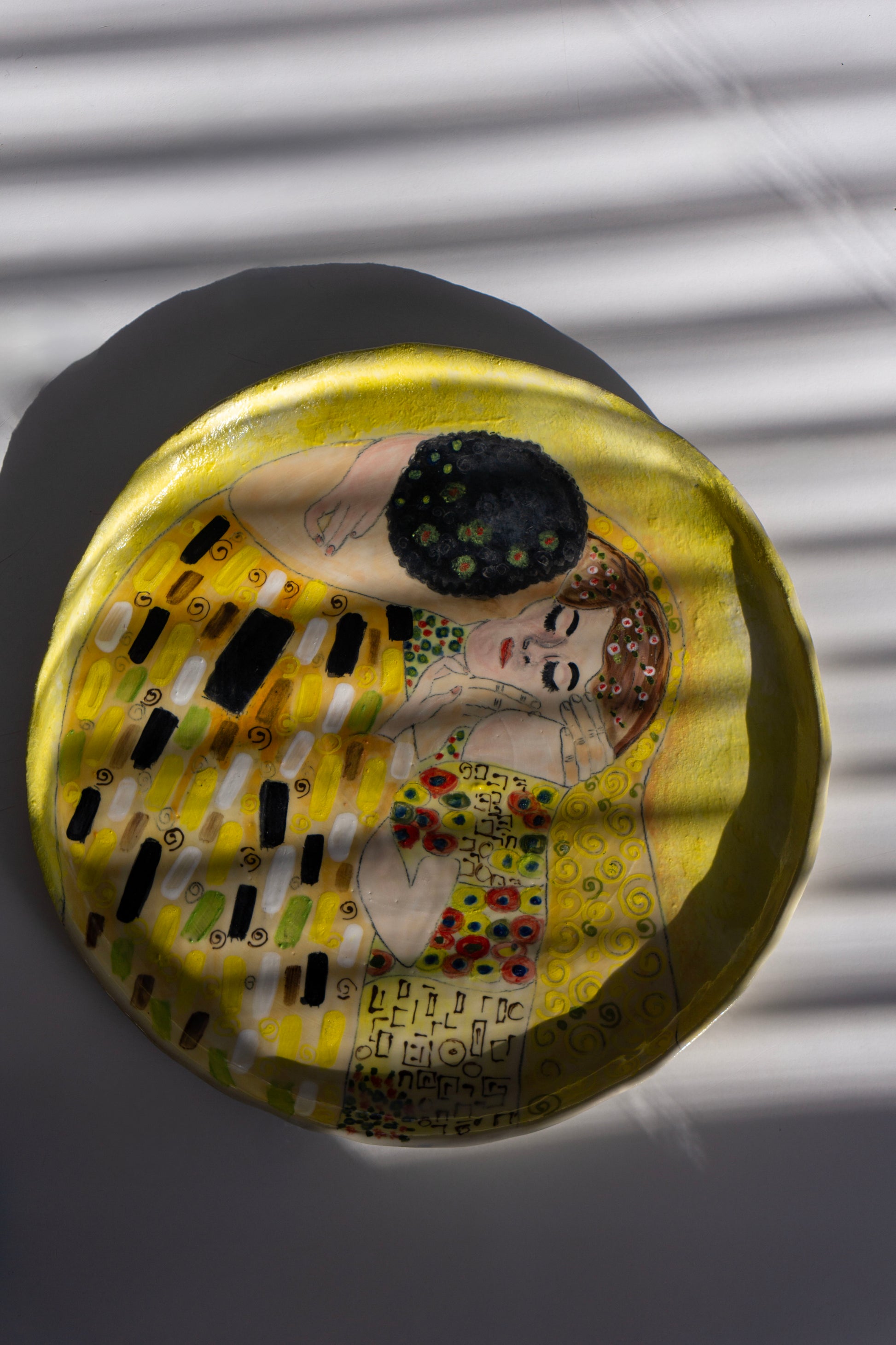 Inspired by Gustav Klimt the iconic masterpiece “The Kiss”, this hand-painted porcelain plate reinterprets one of the most celebrated symbols of love in art history.