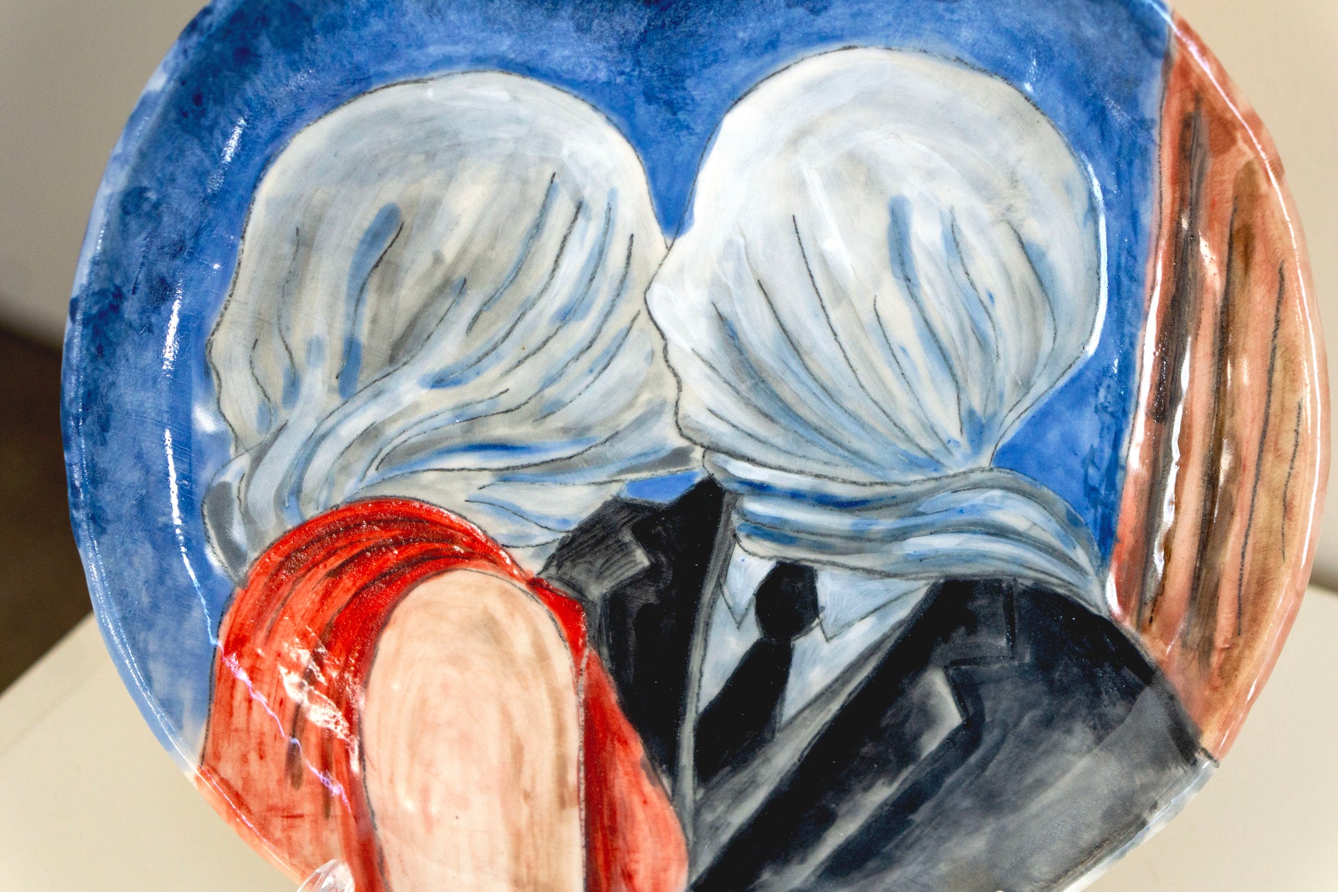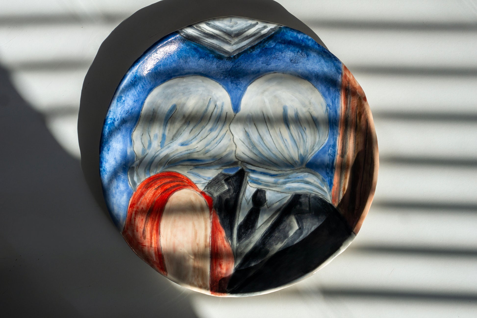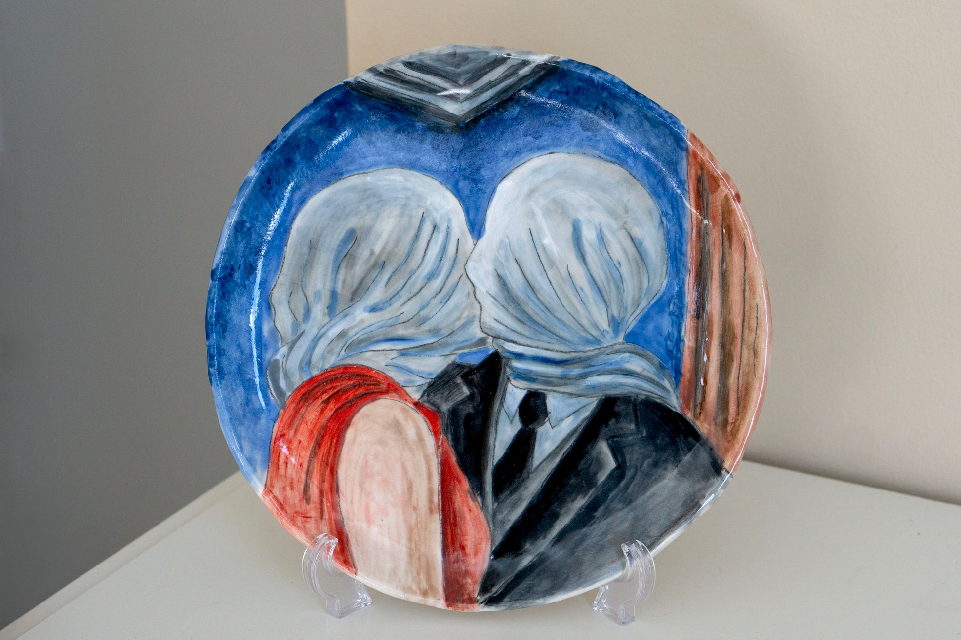 Inspired by the surreal romantic imagery of René Magritte, this hand-painted ceramic plate captures a minimalist faceless kiss — a timeless symbol of intimacy and connection.