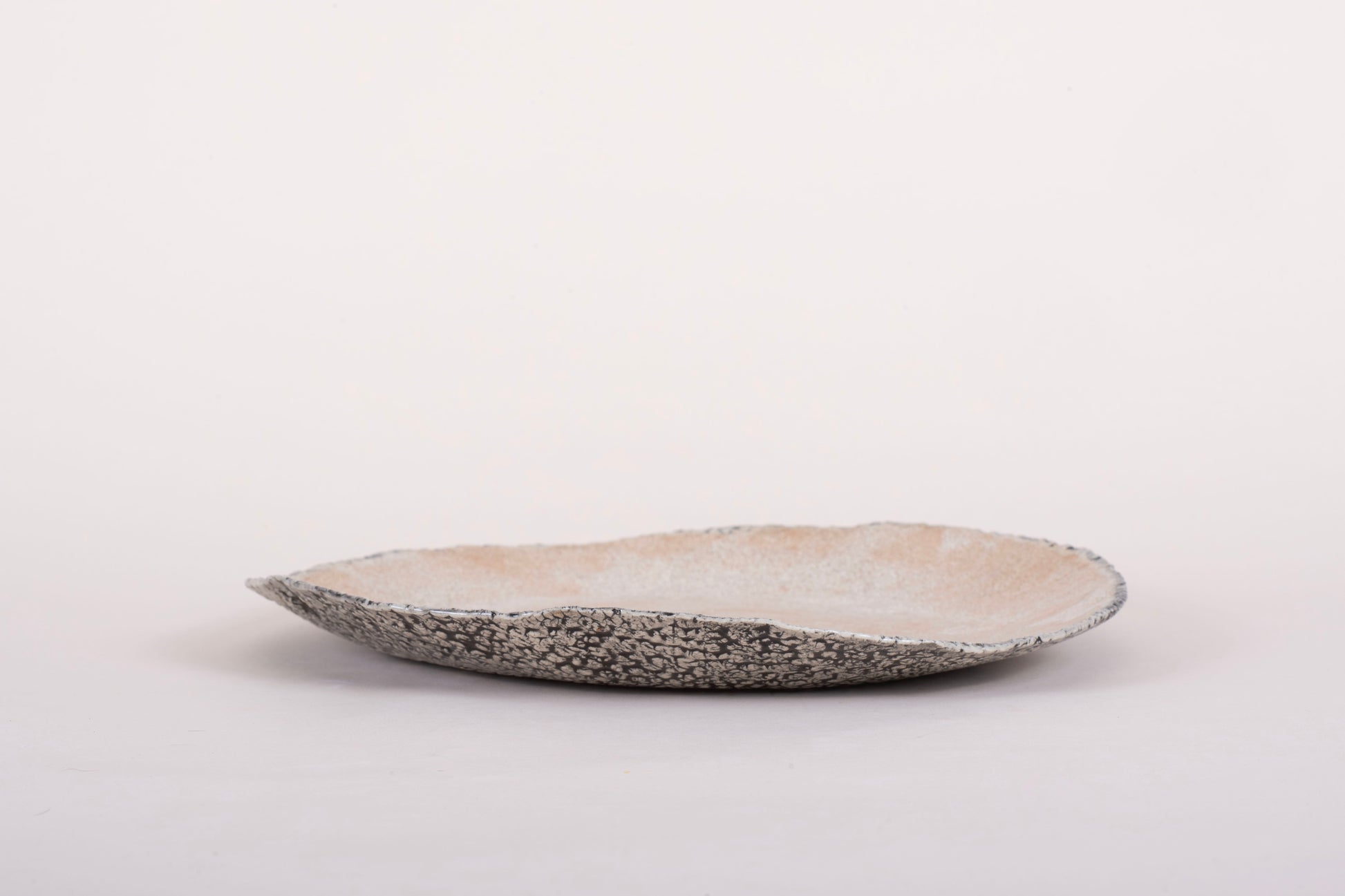 The tactile coral underside invites touch; the dark upper surface frames the plate like a stage. Designed to support bold compositions and subtle gestures alike.