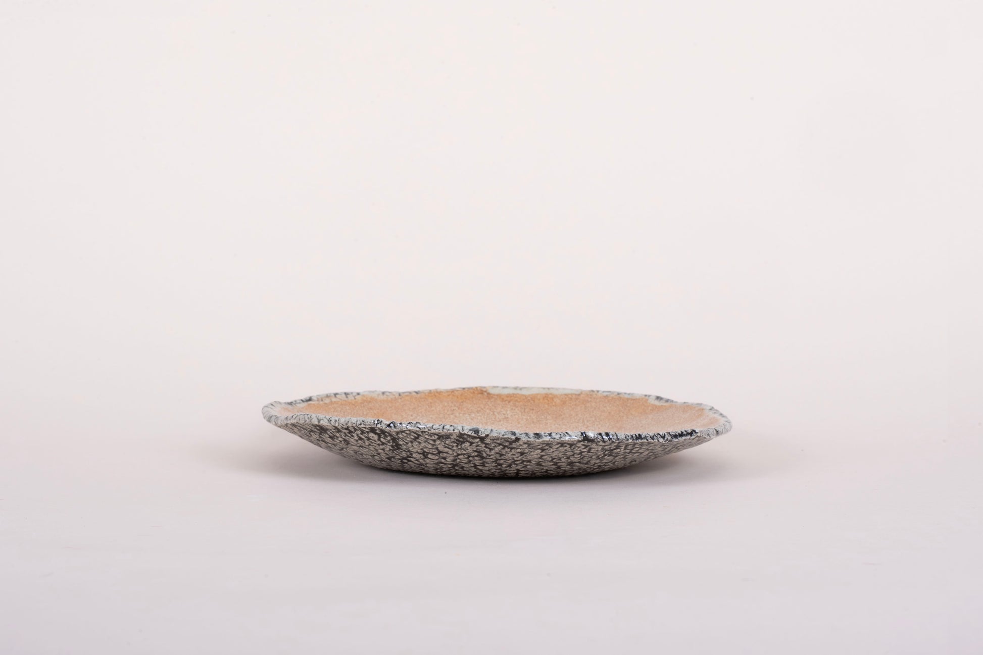 The coral-toned base radiates warmth, while the deep charcoal glaze settles like dusk over desert sand. Smooth to the touch, grounding to the eye — this plate is a sculptural stillness that asks to be held.